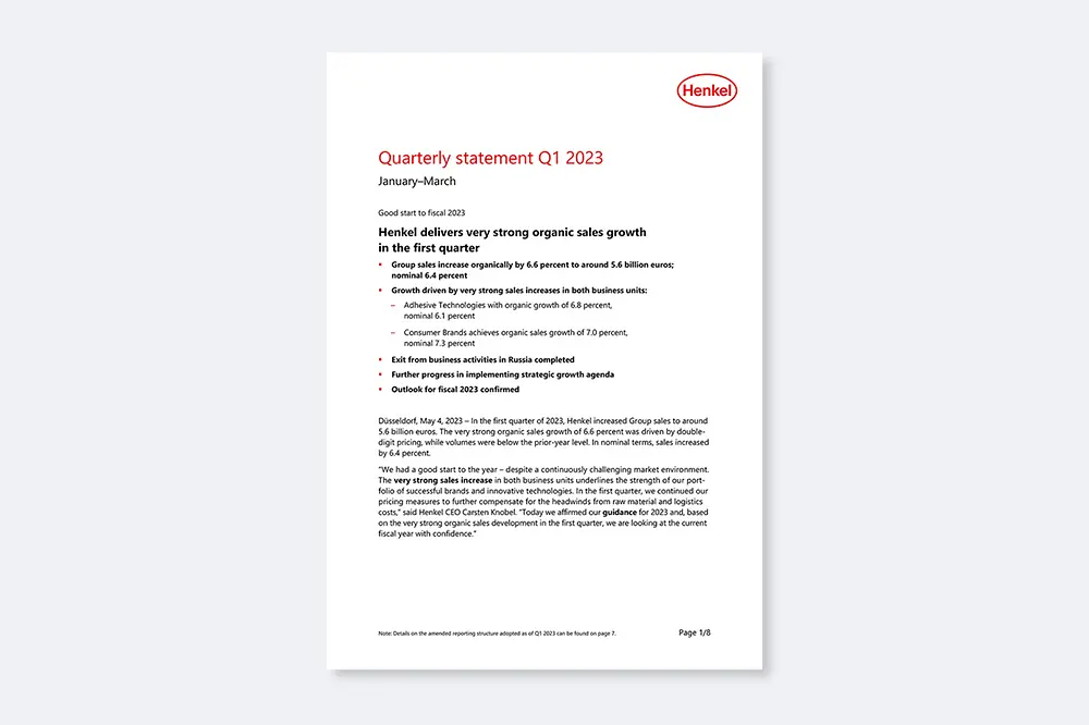Starting from the first quarter of 2023, Henkel has amended its reporting structure to reflect its new organizational setup. Going forward, the company will be reporting on the performance of its two business units, Adhesive Technologies and Consumer Brands. As announced, Henkel will also be reporting key sales figures at the business area level, thus increasing transparency. Specifically, the company is now reporting sales as well as nominal and organic sales growth. In the Consumer Brands business unit, these figures are reported for the business areas Laundry & Home Care, Hair and Other Consumer Businesses. In addition, Henkel is optimizing the organizational structure within its Adhesive Technologies business unit in order to use scale and competence benefits even more efficiently, while at the same time ensuring close customer and market proximity. Going forward, the business unit will comprise the three business areas Mobility & Electronics, Packaging & Consumer Goods, and Craftsmen, Construction & Professional. This new structure is already reflected in the present Quarterly Statement for the first quarter of 2023, hence ahead of its full organizational implementation effective in the second quarter of 2023.